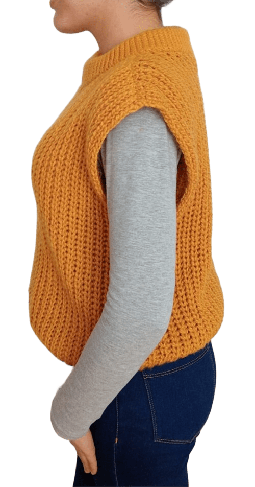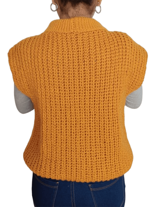 Chaleco tejido elaborado con hilo grueso de alta calidad, su acabado voluminoso brinda calidez y estilo sin sacrificar comodidad. Con un cuello redondo alto y mangas cortas, se adapta perfectamente para usar sobre camisetas básicas o prendas más ajustadas. El vibrante tono mostaza añade un toque moderno y atrevido, ideal para quienes desean resaltar su look con piezas únicas y hechas con dedicación.