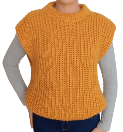 Chaleco tejido elaborado con hilo grueso de alta calidad, su acabado voluminoso brinda calidez y estilo sin sacrificar comodidad. Con un cuello redondo alto y mangas cortas, se adapta perfectamente para usar sobre camisetas básicas o prendas más ajustadas.